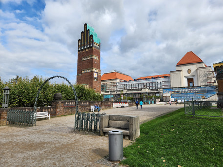 From Hermann and Lydia's in Heusenstamm, we took a short drive down to the city of Darmstadt, home of the pharmaceutical company, Merck, and a technical university. We went to see the Mathildenhöhe, a world cultural site, that includes the “5 finger” wedding tower and a host of other buildings constructed shortly after 1900 in the Art Deco style. The Wedding Tower commemorates the 1905 wedding of Princess Eleonore to Prince Ernst Ludwig. The tower was completed three years after the wedding, and is still the place where the “Standesamt” is located, where the civil wedding ceremonies are conducted. We went up the tower, and the views were quite clear, so you could easily see the skyline of Frankfurt, the Taunus range, the Donnersberg and the Pfälzer Wald in the Pfalz, as well as towards Heidelberg in the south.